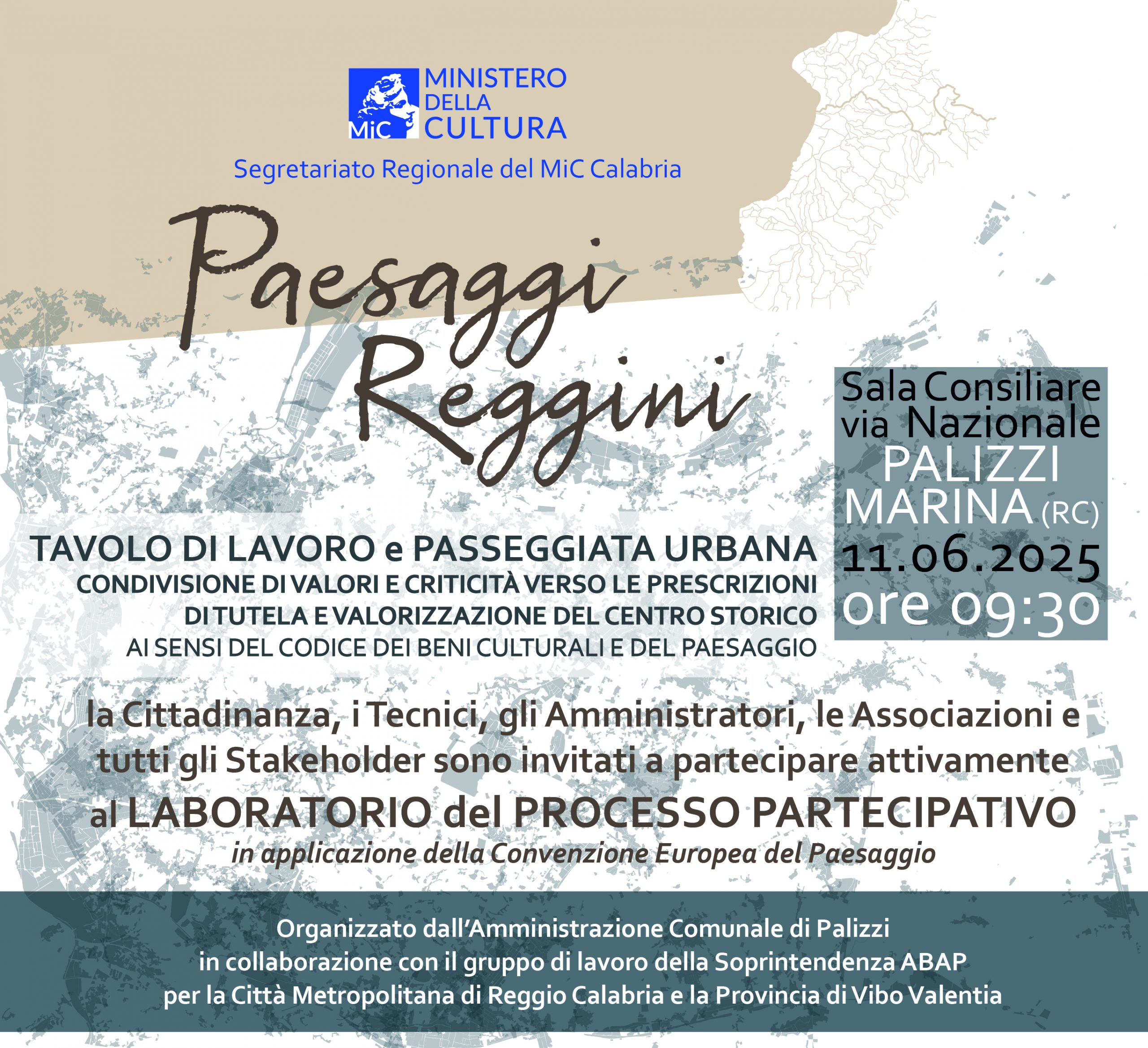 L’11 giugno 2025, alle ore 9.30, presso la Sala Consiliare di Palizzi Marina, in via Nazionale, si svolgerà il nuovo Laboratorio del progetto “Paesaggi Reggini”, ideato dalla Soprintendenza ABAP per la Città Metropolitana di Reggio Calabria e la Provincia di Vibo Valentia.