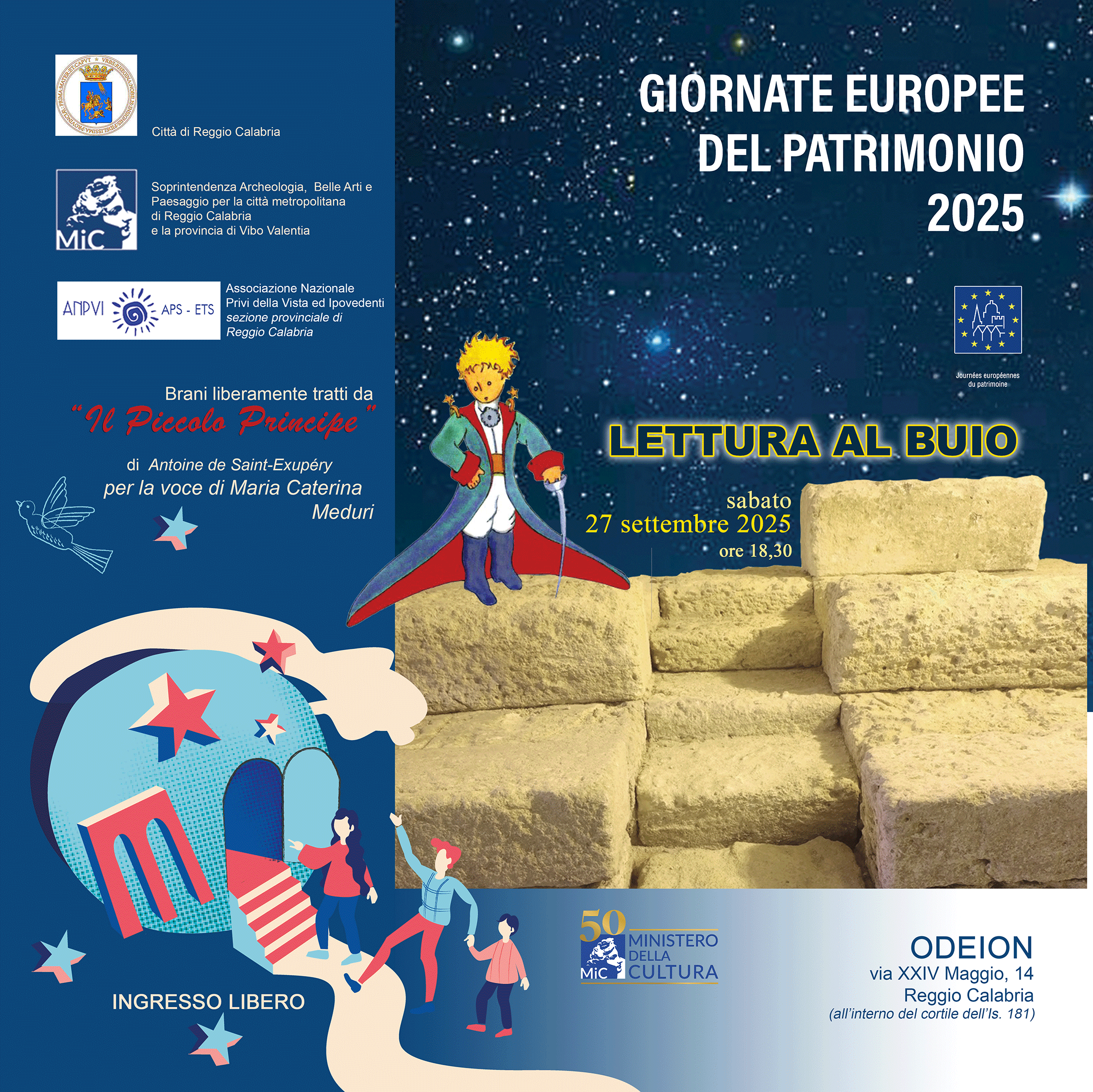 In particolare sabato 27 settembre, alle ore 18,30, nell’edificio che custodisce i resti dell’antico Odéion, nell’isolato delimitato da via del Torrione, via Demetrio Tripepi, via XXIV Maggio e via San Paolo, in pieno centro storico, in collaborazione con l’ANPVI- Associazione Nazionale Ipovedenti e Privi della Vista, verrà presentata l’attività sensoriale “ Letture al buio”. I brani tratti da Il piccolo principe di Antoine de Saint-Exupéry e la voce di Maria Caterina Meduri condurrano gli spettatori in una dimensione nuova, dove gli occhi riposeranno, consentendo agli altri sensi, in particolare l’udito, l’olfatto ed il tatto, di ricreare una percezione vivida del racconto, con l’obiettivo di favorire l’inclusione e la consapevolezza delle persone con disabilità visive. L’antico teatro magnogreco diventa dunque luogo di integrazione ed interazione nel quale la fruizione ampliata del patrimonio culturale diventa strumento di inclusione, salute e benessere sociale, attuando così le buone prassi mirate a favorire una maggiore accessibilità agli spazi e ai contenuti dei luoghi del patrimonio come diritto universale alla partecipazione culturale, aspetto fondamentale di integrazione alla vita della comunità.