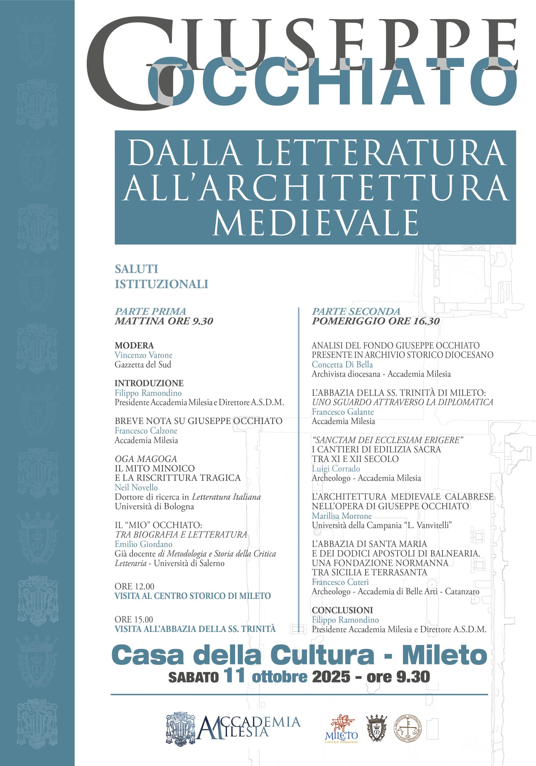Sabato 11 ottobre 2025 ore 15. Convegno “Giuseppe Occhiato, dalla letteratura all’architettura medievale”. Mileto, Casa della Cultura. Un convegno organizzato dall’Accademia Milesia per approfondire la figura di Giuseppe Occhiato, grande studioso dei resti monumentali di Mileto Antica capitale normanna. Il Convegno comprende una visita al Parco Archeologico Medievale di Mileto Antica.